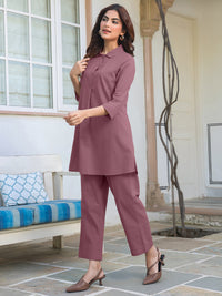 The Mauve Harmony Co-Ord Set in a soothing mauve hue is crafted from breathable flex cotton, offering a relaxed yet structured look. The top features a classic shirt collar with delicate button ornamentation, regular 3/4th sleeves, and a handy side pocket for added functionality.