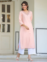 Elevate your ethnic wardrobe with this peach cotton embroidered straight kurti. Designed with a V-neckline and adorned with delicate multicolored floral embroidery on the yoke, it exudes simple sophistication. The straight silhouette ensures comfort and ease of wear, while pairing seamlessly with your favorite bottoms. Perfect for casual outings, festive occasions, or a chic everyday ethnic look.