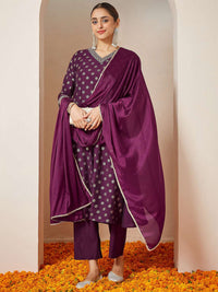 • Bring festive sophistication to your wardrobe with this wine chanderi silk kurta set. Featuring floral foil prints, zari and sequin embroidery on the v-neckline and sleeve hems, and a practical side pocket, it pairs beautifully with solid straight pants and a silk blend dupatta with subtle shimmer and gota patti border — ideal for weddings, festivals, and special occasions.